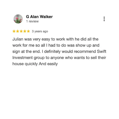 “ Julian was very easy to work with he did all the work for me so all I had to do was show up and sign at the end. I definitely would recommend Swift Investment Group to anyone who wants to sell their house quickly And easily”
