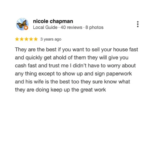 “ They are the best if you want to sell your house fast and quickly get ahold of them they will give you cash fast and trust me I didn’t have to worry about any thing except to show up and sign paperwork and his wife is the best too they sure know what they are doing keep up the great work. ”